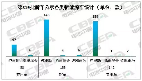2019年4月18日,國家工信部在其官方網(wǎng)站公示了申報第319批《道路機動車輛生產(chǎn)企業(yè)及產(chǎn)品公告》(以下簡稱《新車公示》)新產(chǎn)品,公示期7天,截止到4月24日。本次申報新能源汽車產(chǎn)品共350款,其中,新能源乘用車53款,新能源客車155款,新能源專用車142款。隨著2019年國家財政補貼政策的落地,相較今年前3批新車公示,本批次申報的車型數(shù)量明顯增多。