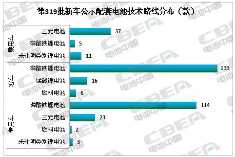 從動力電池技術路線來看,搭載磷酸鐵鋰電池的車型有252款,占比達72%;搭載三元電池的車型有60款,占比17%;搭載錳酸鋰電池的車型有16款錳,占比5%;搭載未注明類別鋰電池的車型有14款,占比4%;搭載燃料電池的車型有8款,占比2%。其中三元電池在乘用車領域優(yōu)勢明顯,而磷酸鐵鋰電池在客車和專用車領域占據(jù)主導地位。