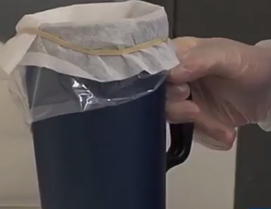 (4)準(zhǔn)備采精杯。準(zhǔn)備一個新的集精袋,貼壁套在干凈的采精杯內(nèi)。使用精液過濾紙(或無菌紗布)覆蓋在采精杯上,用一條新的橡皮筋固定。