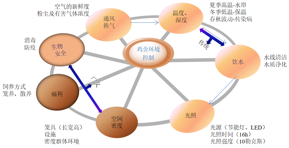 雞舍的保溫和通風(fēng)措施要根據(jù)氣溫的變化而調(diào)整,在保證雞舍適宜溫度的同時(shí),也要兼顧通風(fēng)換氣。規(guī)?;u舍一般采取最小通風(fēng)模式,根據(jù)氣溫的變化及時(shí)調(diào)整風(fēng)機(jī)開關(guān)數(shù)量及通風(fēng)口的大小,達(dá)到既滿足換氣的需要,又實(shí)現(xiàn)調(diào)節(jié)溫度的目的。雞舍內(nèi)二氧化碳含量不能高于0.3%,NH3濃度不超過(guò)15ppm,硫化氫濃度控制在10ppm以下。雞舍內(nèi)環(huán)境控制,如圖1。