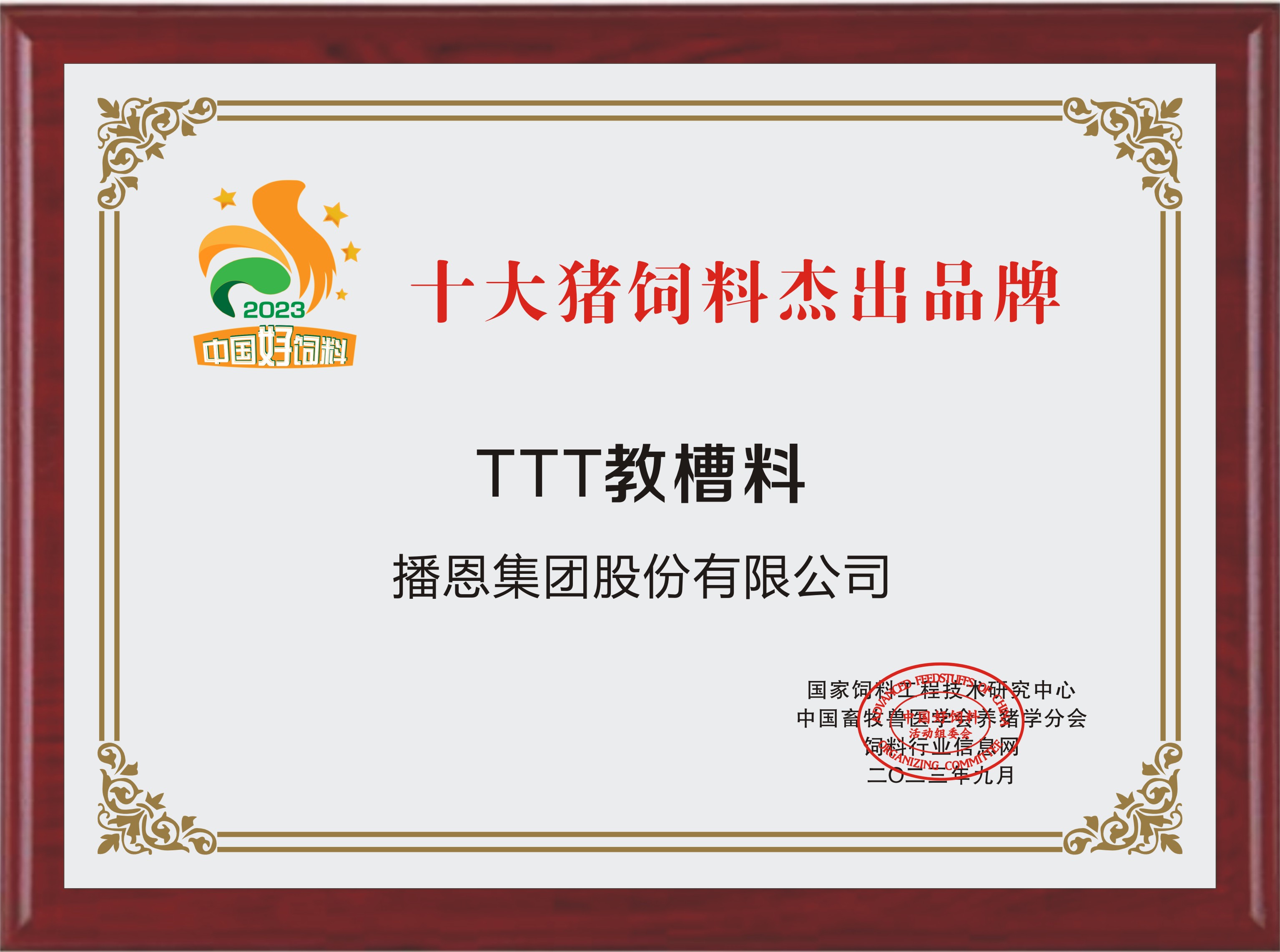“TTT教槽料——十大豬飼料杰出品牌”獎(jiǎng)牌