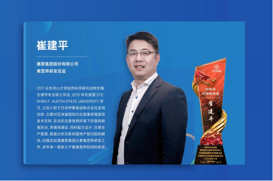 此次獲獎,是對崔建平博士專業(yè)能力與創(chuàng)新精神的高度認可,更是對播恩蛋雞料研發(fā)成果的肯定。展望未來,播恩集團將持續(xù)加大蛋雞料研發(fā)投入,推出更多創(chuàng)新優(yōu)質(zhì)產(chǎn)品,攜手養(yǎng)殖戶共創(chuàng)畜牧行業(yè)美好未來,持續(xù)引領(lǐng)蛋雞料行業(yè)創(chuàng)新發(fā)展潮流。