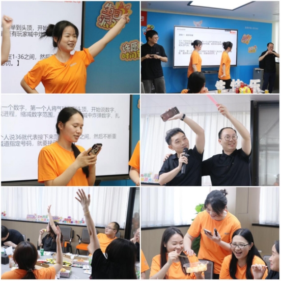 致辭結(jié)束后,生日會(huì)進(jìn)入互動(dòng)環(huán)節(jié),現(xiàn)場(chǎng)也瞬間化作歡樂(lè)的海洋。美食香氣四溢間,各類趣味游戲輪番登場(chǎng),徹底打破了平日里的工作嚴(yán)肅氛圍。在“表情包猜成語(yǔ)”環(huán)節(jié),技術(shù)人員一改往日專注敲代碼的沉穩(wěn)模樣,為了搶答成功,快速高舉手臂,甚至踮起腳尖,躍躍欲試的模樣引得全場(chǎng)笑聲不斷。最令人驚喜的當(dāng)屬法務(wù)和審計(jì)部門的“跨界表演”。這些平日里嚴(yán)謹(jǐn)認(rèn)真、專注于合同條款與數(shù)據(jù)表格的同事們,被青春洋溢的播恩學(xué)妹熱情邀請(qǐng),臨時(shí)上陣挑戰(zhàn)《愛(ài)你》舞蹈。沒(méi)有排練、毫無(wú)經(jīng)驗(yàn)的他們,動(dòng)作有的快半拍、有的慢半拍,甚至手腳“各自為政”,但卻絲毫不怯場(chǎng),努力跟上節(jié)奏的認(rèn)真模樣,搭配著略顯笨拙的舞步,讓現(xiàn)場(chǎng)充滿歡樂(lè)的氣氛,歡呼聲與掌聲此起彼伏……一個(gè)個(gè)游戲,一個(gè)個(gè)互動(dòng),笑聲與音樂(lè)聲交織,繪就出一幅溫暖而熱烈的團(tuán)隊(duì)情誼畫卷。