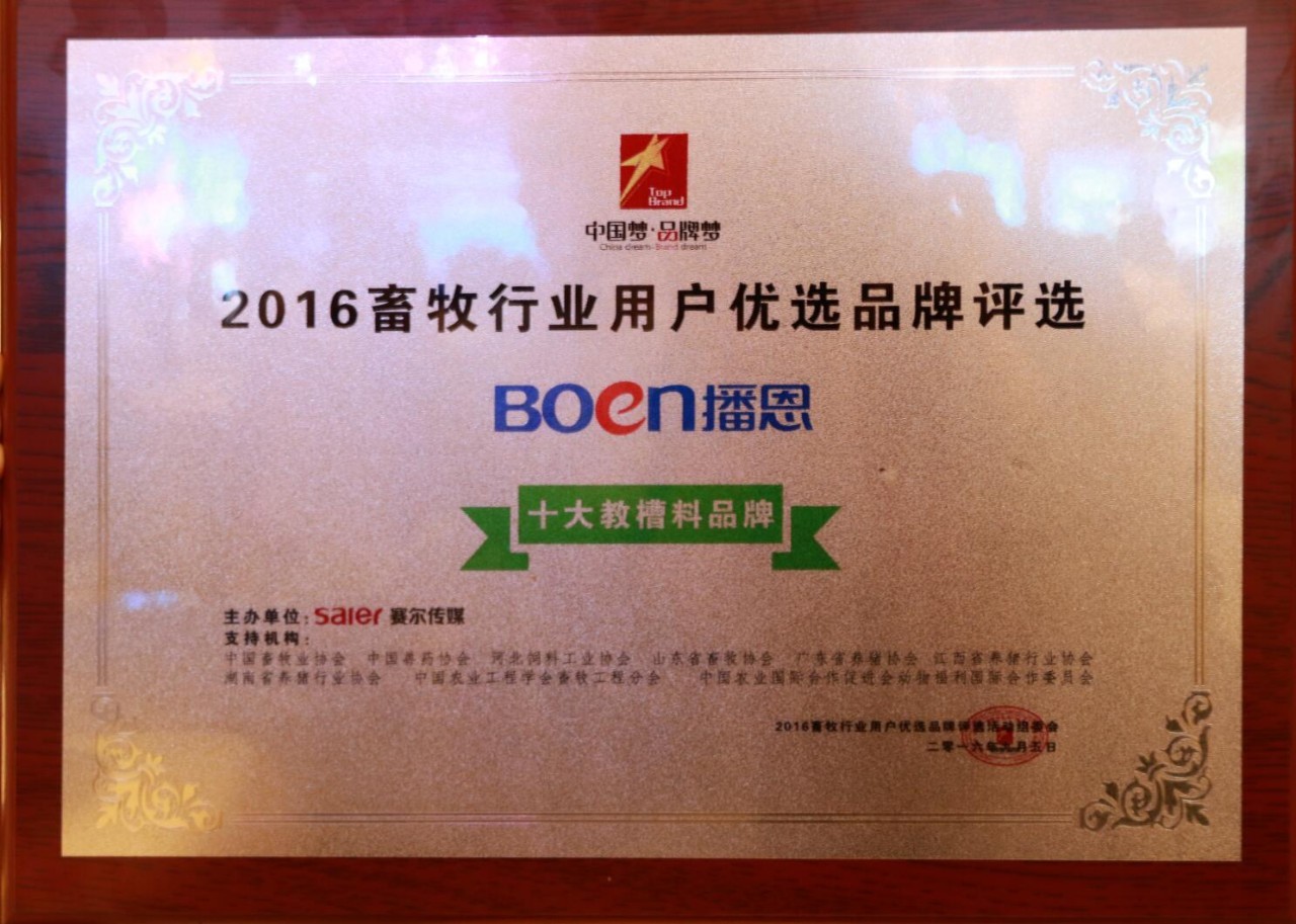 播恩集團品牌、產(chǎn)品得到了廣大養(yǎng)殖戶的進一步認可,產(chǎn)品綠色環(huán)保,企業(yè)高效踐行。此獎項經(jīng)由消費者推薦、網(wǎng)絡(luò)公開投票、專家評審打分等層層篩選得出。網(wǎng)絡(luò)投票開始后,播恩集團旗下的“TTT”、“開心套餐”、“速八”等的口碑影響力被養(yǎng)殖網(wǎng)友們所津津樂道。播恩集團在教槽料品牌的支持投票率也一路遙遙領(lǐng)先,并最終經(jīng)顧問專家團隊的共同評定,播恩集團榮獲“用戶優(yōu)選十大教槽料品牌”。