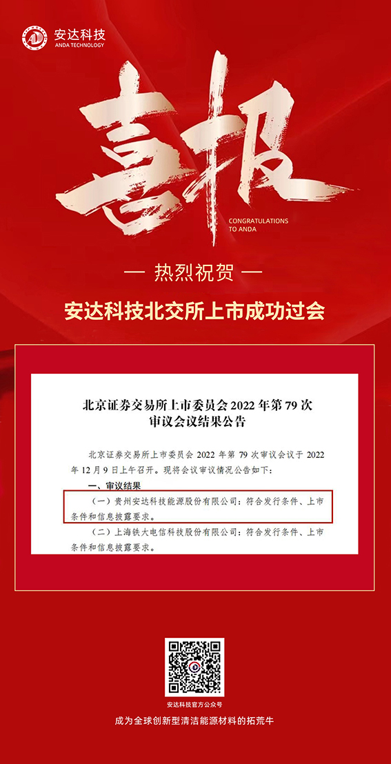 近日,北京證券交易所上市委員會(huì)2022年第79次審議會(huì)議結(jié)果公告顯示:貴州安達(dá)科技能源股份有限公司(以下簡(jiǎn)稱“安達(dá)科技”、“公司”)(830809.NQ)符合發(fā)行條件、上市條件和披露要求,成功過會(huì)。